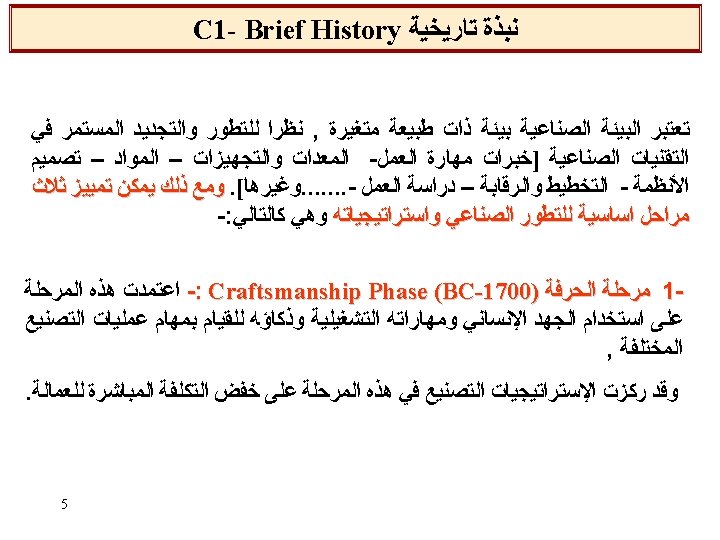 4 c- Continues & discrete Manufacturing ﺍﻟﺘﺼﻨﻴﻊ ﺍﻟﻤﺴﺘﻤﺮ ﻭﺍﻟﻤﺘﻘﻄﻊ Continuous (Flow) Discrete units (Flow) Continuous (Batch) Discrete Units (Batch) 24 Manufacturing processes Input Manufacturing processes Input Output Manufacturing Output processes Manufacturing processes Output