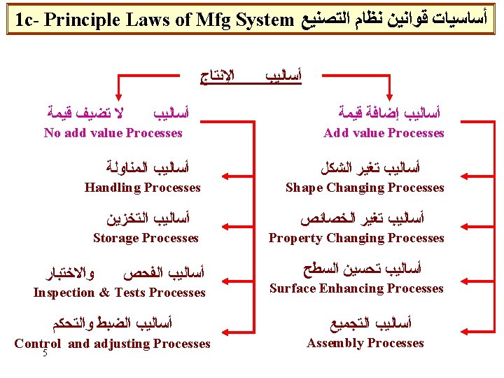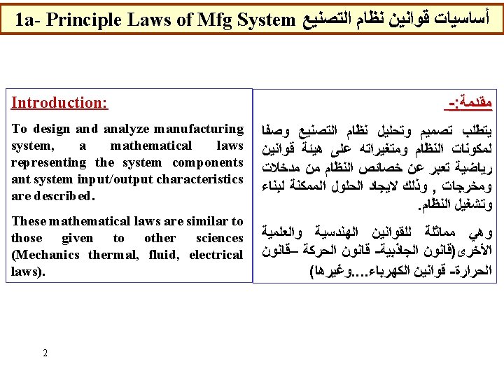 1 b- Principle Laws of Mfg System ﺃﺴﺎﺳﻴﺎﺕ ﻗﻮﺍﻧﻴﻦ ﻧﻈﺎﻡ ﺍﻟﺘﺼﻨﻴﻊ 1 st principle ﺍﻷﺴﺎﺱ ﺍﻷﻮﻝ : - Little Law ( Work in Process) WIP = Rp x T = Production Rate x Throughput Time X per Time 1 0 2 1/X 3 2/X …………… N-2 N-1 N-3/X N-2/X N N-1/X X per Time N/X FINISH Time 2 nd principle ﺍﻷﺴﺎﺱ ﺍﻟﺜﺎﻧﻲ : - Conservation of Matter Input = Output Raw Material Equipment Tooling & Fixture 4 Energy Labor Good /service Manufacturing Process Scrap/Defective Waste: Chips/Tools
