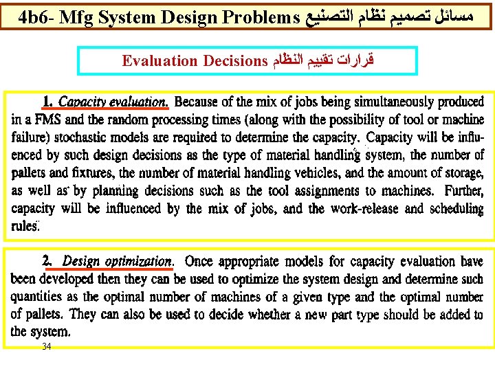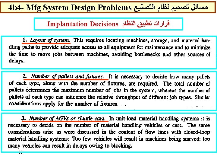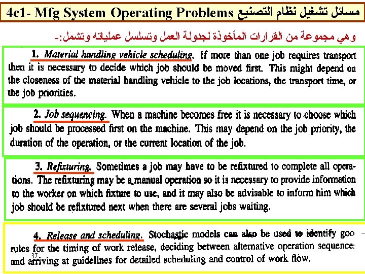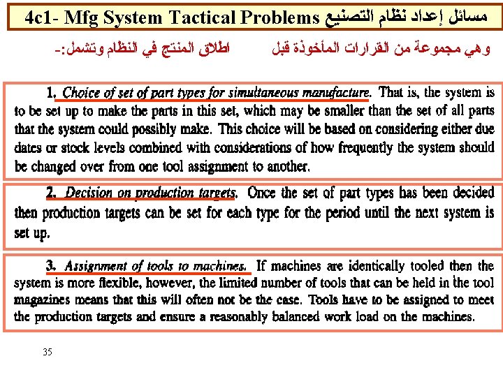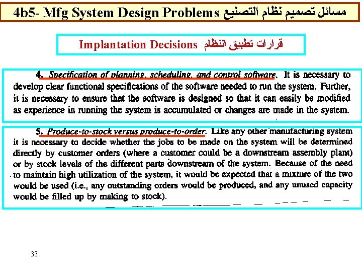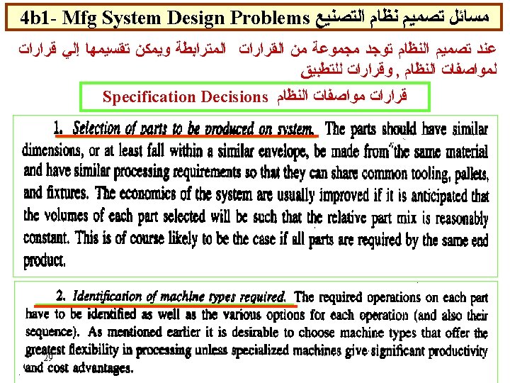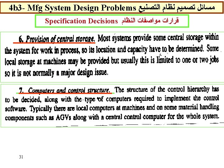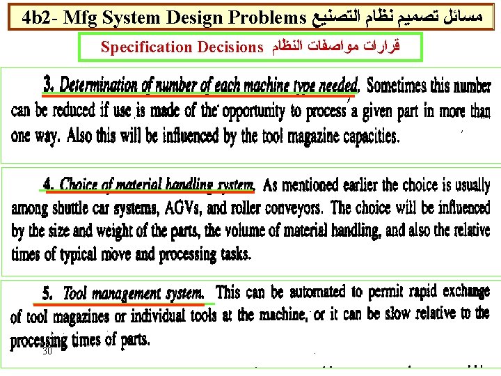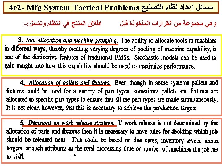 4 a- Mfg System Problems ﻣﺴﺎﺋﻞ ﻧﻈﺎﻡ ﺍﻟﺘﺼﻨﻴﻊ Manufacturing systems are designed and operating based on three planning issues to be solved as follows: : ﺗﺨﻄﻴﻂ ﺍﺳﺘﺮﺍﺗﻴﺠﻲ Strategic Planning ﺗﺨﻄﻴﻂ ﺗﻜﺘﻴﻜﻲ Tactical Planning ﺗﺨﻄﻴﻂ ﺗﺸﻐﻴﻠﻲ Operational Planning ﺍﻷﺪﺍﺀ ﺗﻘﻴﻴﻢ 28 Performance Evaluations : ﺗﺼﻤﻴﻢ ﺍﻟﻨﻈﺎﻡ Justification • ﺍﻟﺘﺒﺮﻳﺮ Design • ﺍﻟﺘﺼﻤﻴﻢ Installation • ﺍﻟﺘﺮﻛﻴﺐ : ﺍﻹﻧﺘﺎﺝ ﺧﻄﻂ Batching • ﺍﻟﻤﺠﻤﻮﻋﺔ Loading • ﺍﻟﺘﺤﻤﻴﻞ Routing • ﺍﻟﻤﺴﺎﺭ : ﺧﻄﻂ ﺍﻟﺘﺸﻐﻴﻞ Sequencing • ﺍﻟﺘﺴﻠﺴﻞ Scheduling • ﺍﻟﺠﺪﻭﻟﺔ Dispatching ﺍﻻﺭﺳﺎﻝ •