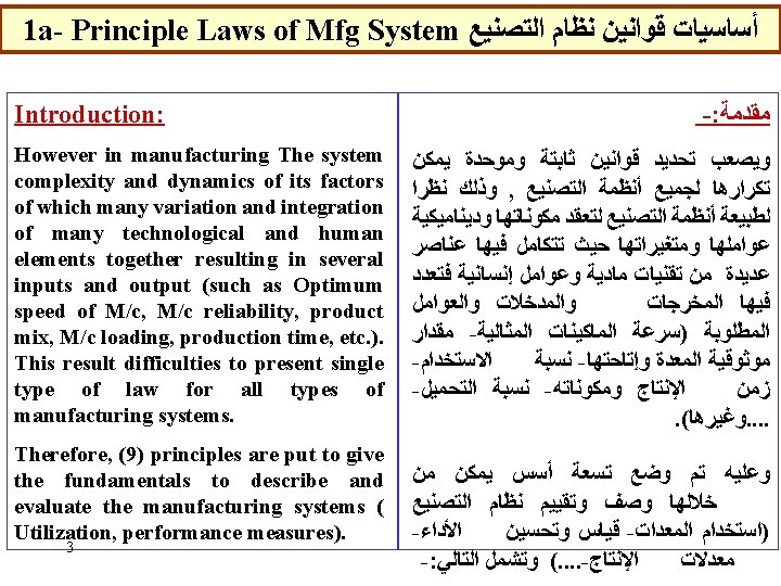 1 f- Principle Laws of Mfg System ﺃﺴﺎﺳﻴﺎﺕ ﻗﻮﺍﻧﻴﻦ ﻧﻈﺎﻡ ﺍﻟﺘﺼﻨﻴﻊ 5 th Principle ﺍﻷﺴﺎﺱ ﺍﻟﺨﺎﻣﺲ : - Object Decay System components behavior can not kept constants with time or could be exactly the same when replaced. (i, . e. bearing wear or gear wheel replacement of a machine changes the machine behavior and could not be the same. This affect the system performance. ) 6 th Principle ﺍﻷﺴﺎﺱ ﺍﻟﺴﺎﺩﺱ : - Random Behavior of system Components Inherently stochastic behavior of system Components or complex to understand system, system events are not precisely predicted, (i. e. Cutting fluid condition- Breakdown behavior of each machine -Repair time of each machine- etc). Statistical distribution and Probability analysis of each 8 component is required.