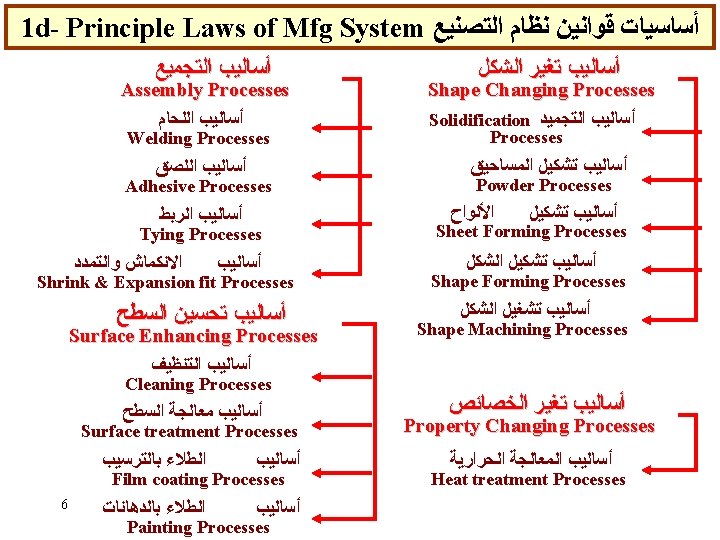 1 g- Principle Laws of Mfg System ﺃﺴﺎﺳﻴﺎﺕ ﻗﻮﺍﻧﻴﻦ ﻧﻈﺎﻡ ﺍﻟﺘﺼﻨﻴﻊ 7 th Principle ﺍﻷﺴﺎﺱ ﺍﻟﺴﺎﺑﻊ Obsolescence : - Technology Advances and As the system components Technology develop, the system becomes obsolete before decaying. This changes the nature of system production and performance (i. e. Loss of market due to loss ofthquality or response of delivery). 8 Principle ﺍﻷﺴﺎﺱ ﺍﻟﺜﺎﻣﻦ : - Limit on (Human) Rationality The limit of memory, experience, and capability and the change of natural characteristics with time limit the realization of optimality and tend to solve for satisfaction only at the time. 9 th Principle ﺍﻷﺴﺎﺱ ﺍﻟﺘﺎﺳﻊ Tasks : -Combining/Simplifying/Eliminating The tasks analysis and design are principle in providing gains 9 in time saving, money, and energy. Thus increasing productivity, quality, and reducing cost could be achieved.