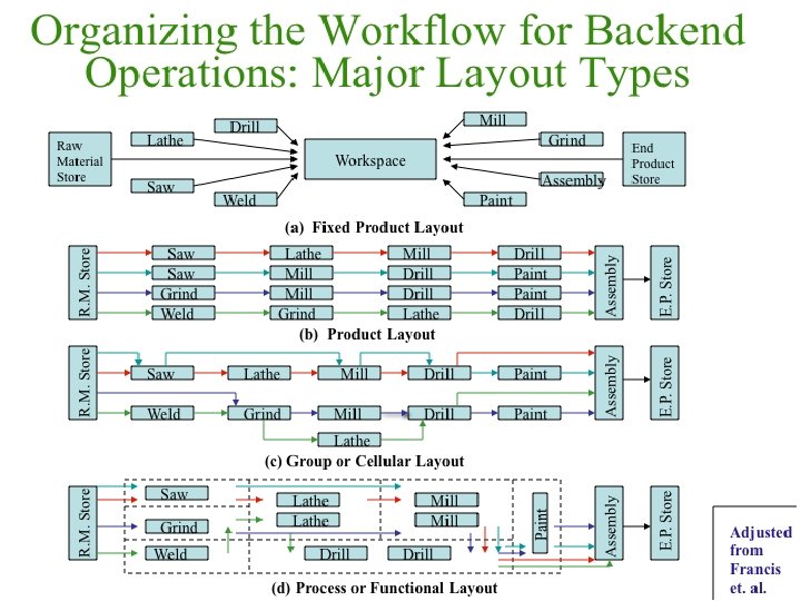 Fixed Product Layout • Workpiece remains fixed and the various processes are brought to it • Used primarily in ship-building. • Sometimes can be the preferred layout when high levels of precision are in order. • Production activity is controlled through project management related practices.