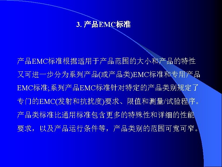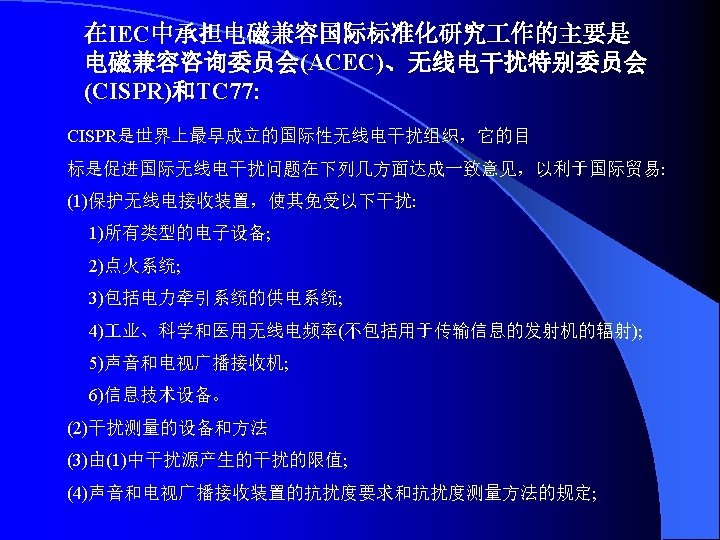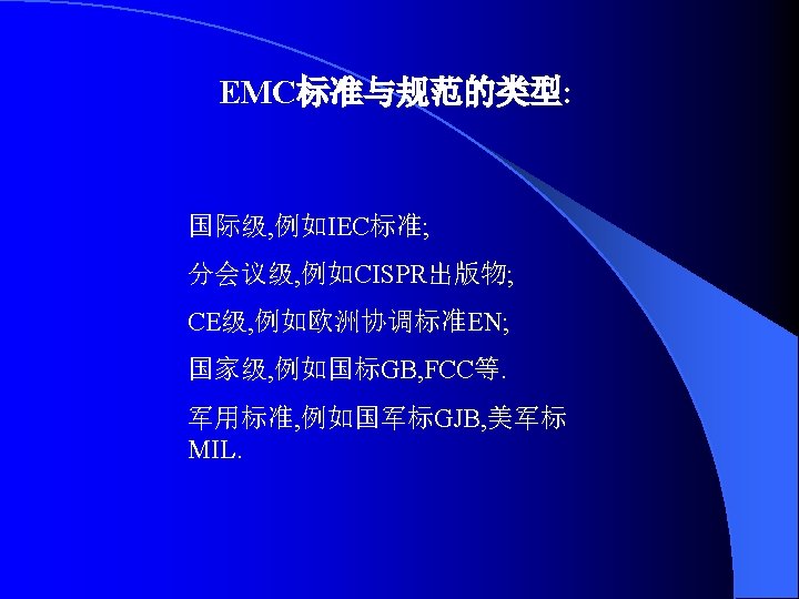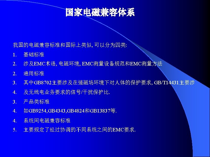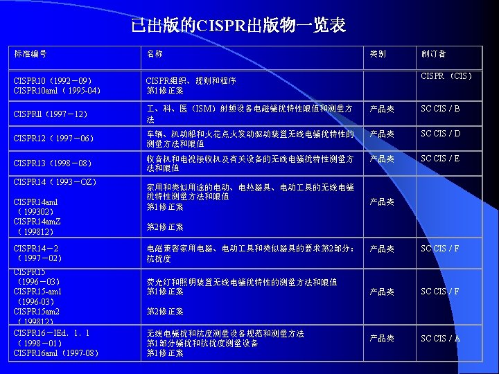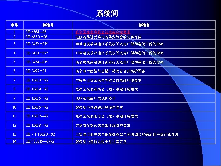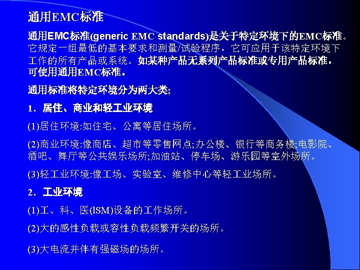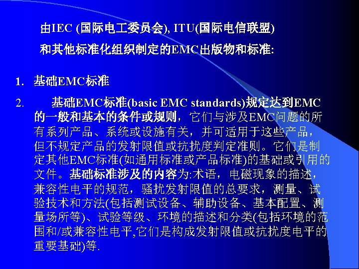 IEC 61000《电磁兼容》标准 IEC标准编号 出版日期 标准名称 第 1部分 总则 General EC/TR 3 61000-l-l 1992-04 基本定义和术语的应用和解释 Application and luterpretation of fundamental definitions and terms 第 2部分 环境 Environment IEC/TR 3 61000-2-l 1990-05 环境的描述公用供电系统中低频传导骚扰和信号传输的电磁环 境 Description of the environment -Electromagnetic environment for low- frequency conducted disturbances and signalling in public power supply systems IEC 61000-2-2 1990— 05 公用低压供电系统中的低频传导骚扰和信号传输的兼容电平 Compatibility levels for low- frequency conducted disturbances and signalling In public low-voltage power supply systems IEC/TR 3 61000-2-3 1992-09 环 境 的 描 述 辐 射 和 非 网 络 频 率 的 传 导 现 象 Description of the environment- Radiated and non- network一 frequency-rated conucted phenomena IEC 61000-2-4 1994-02 业 企 业 中 低 频 传 导 骚 扰 的 兼 容 电 平 Compatibility levels in Industrial plants for low- frequency conducted disturbances