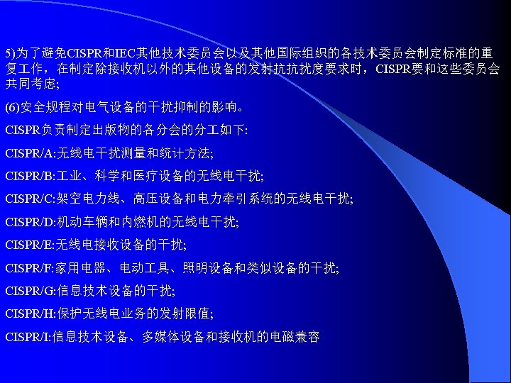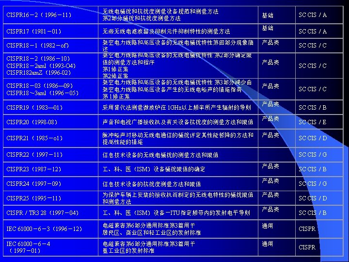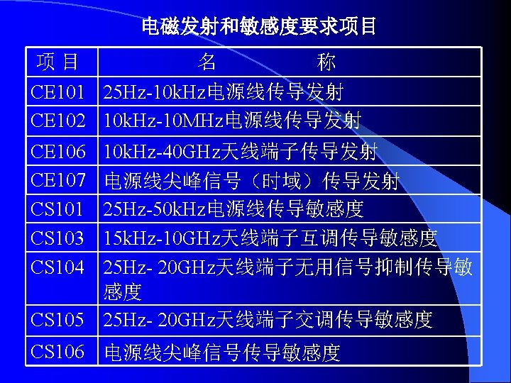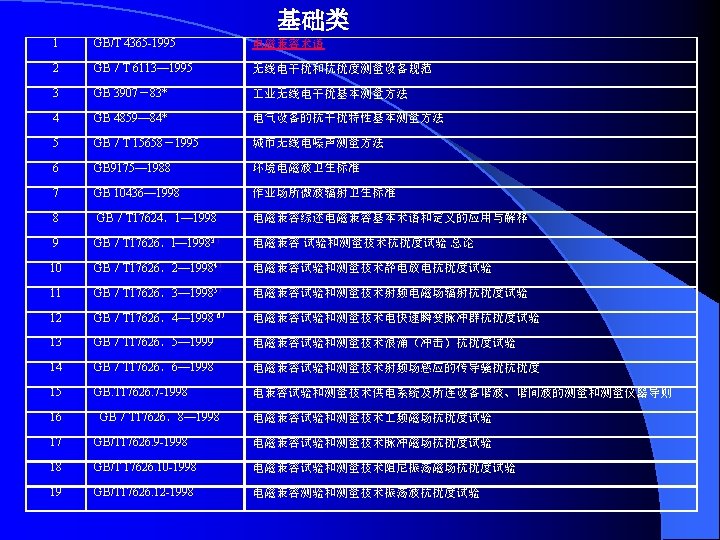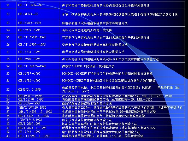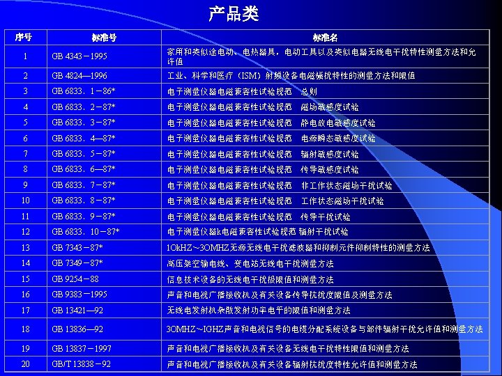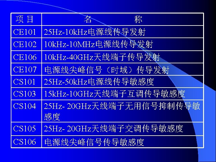 IEC 61000-4-7 1991一07 供电系统及所连设备谐波和谐间波的测量和仪表通用指南 General guide on harmonics and Interhamonics measurements and Instrumentation, for power supply systems and equipment connected thereto IEC 61000-4-8 1993-06 频 磁 场 抗 扰 度 试 验 基 础 EMC出 版 物 Power trequency magnetic held immunity test. Basic EMC publication IEC 61000一4-9 1993-06 脉 冲 磁 场 抗 扰 度 试 验 基 础 EMC出 版 物 Pulse magnetic field immunity tests. Basic EMC publication IEC 61000-4 -10 1993-06 阻 尼 振 荡 场 抗 扰 度 试 验 基 础 EMC出 版 物 Damped oscillatory magnetic field immunity tests. Basic EMC publication IEC 6 l. OOO-4-11 1994-06 电 压 暂 降 、 短 期 中 断 和 电 压 变 化 抗 扰 度 试 验 Voltage dips, short Interruptions and voltage variations immunity test IEC 61000-4 -12 1995-05 振 荡 波 抗 扰 度 试 验 基 础 EMC出 版 物 Qscillatory waves immunity tests.Basic EMC publication IEC 61000 -4 -15 1997-11 闪 烁 仪 的 功 能 和 设 Flickermeter-functional and design specifications IEC 61000— 4— 16 1998-01 传导其模骚扰抗扰度试验方法,0-150 k. Hz Test methods for immunity to conducted, common mode disturbance the frequency range 0 to 150 k. Hz IEC 6 l 000-4-24 1997-02 HEMP传 导 骚 扰 保 护 装 置 试 验 方 法 / 基 础 EMC出 版 物 test methods for protection devices for HEMP conducted disturbance .Basic EMC publication 计 规 范