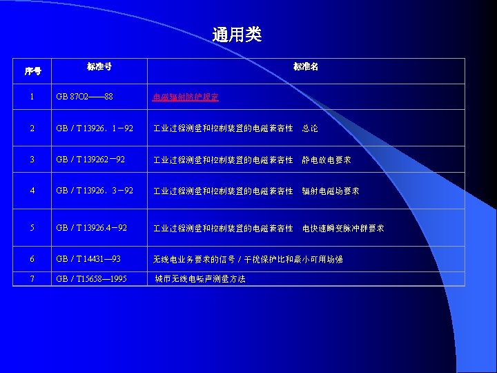 第 5部分 安装与调试导则 Installation and mitigation guidelines IEC/TR 3 61000-5-l 1996-12 总 的 考 虑 基 础 EMC出 General considerations. Basic EMC Publication IEC/TR 3 61000— 5-2 1997 -11 接 地 和 Earthing and cabling IEC/TRZ 61000-5-4 1996-08 IEC 61000— 5— 5 1996-02 HEMP辐 射 骚 扰 保 护 装 置 规 范 基 础 EMC出 版 物 Specifications of protective devices against HEMP radiated dlsturbance.Basic EMC publication HEMP传导骚扰的保护装置规范 基础EMC出版物 Specifications of protective devices for HEMP conducted disturbance .Basic EMC publication 电 缆 版 敷 物 设 第 6部分 通用标准 Generic standard IEC 61000 -6 -1 1997-07 通用标准住宅区、商业区和轻 业环境的抗扰度标准 Generic standard-lmmunity for residential, commercial and light- industrial environments IEC 61000 -6 -2 1999-01 通 用 标 准 业 环 境 的 抗 扰 度 Generic standard-Immunity for Industrial environments IEC 61000-6-xxxx) 1996一01 通用标准住宅区、商业区和轻 业环境的发射标准 Generic emission standard for Industrial environments IEC 610 O 0-6-xxxx) 1997 -01 通 用 标 准 业 环 境 发 射 Generic emission standard for Industrial environments 标 标 准 准