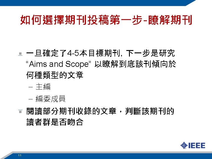 同行評審 Does it address a new and important problem? Is the material original? Are the methods and rationale valid? Do the conclusions make sense? Is it clearly written? Do the illustrations, tables, and charts support the text? Are the references current and relevant to the subject? Is the content appropriate, in scope and level, for the journal? http: //www. ieee. org/publications_standards/publications/ authors/author_guide_interactive. pdf 22