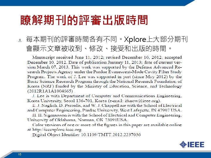 強調原創性 IEEE's policy on duplicate publication states – "authors should only submit original work that has neither appeared elsewhere for publication, nor which is under review for another refereed publication. If authors have used their own previously published work(s) as a basis for a new submission, they are required to cite the previous work(s) and very briefly indicate how the new submission offers substantively novel contributions beyond those of the previously published work(s). " http: //ewh. ieee. org/soc/nps/TNS. htm 29