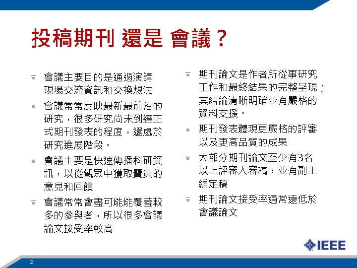 Journals-學術期刊 Journals, Transactions, and Letters are the primary means for publishing technical papers concerning original work in IEEE fields of interest. – The primary purpose of Journals, Transactions, and Letters is to disclose and provide a permanent archival record of original technical work that advances the state of the art or provides novel insights. – Letters are for the publication of brief papers, usually three to four pages in length. 5
