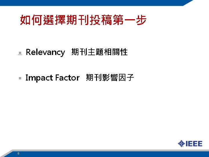 以MTT刊物為例 Transactions New. Research Article YES(6 pages, over-lengthcharge) Tutorial. Article YES(atexpert level) Application Note Review. Article NO YES(atexpert level) Letters YES(3 pages) NO NO NO Magazine NO YES(at. Fundamental to. Intermediatelevel) Research Article: Papers in the journals use the IEEE standard format and must include a Title, Abstract, Introduction, Technical Content, Conclusions, and References. The transactions also include the author biographies. Tutorial: Unique presentation of known material. Valuable methodologies, exhaustive references Application Note: Describe current application of technology: circuits, systems, models, concepts. Review: Historical account of field, exhaustive references, explanation of state-of-the-art, indications of future research 7