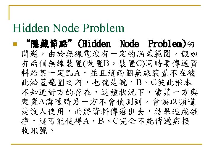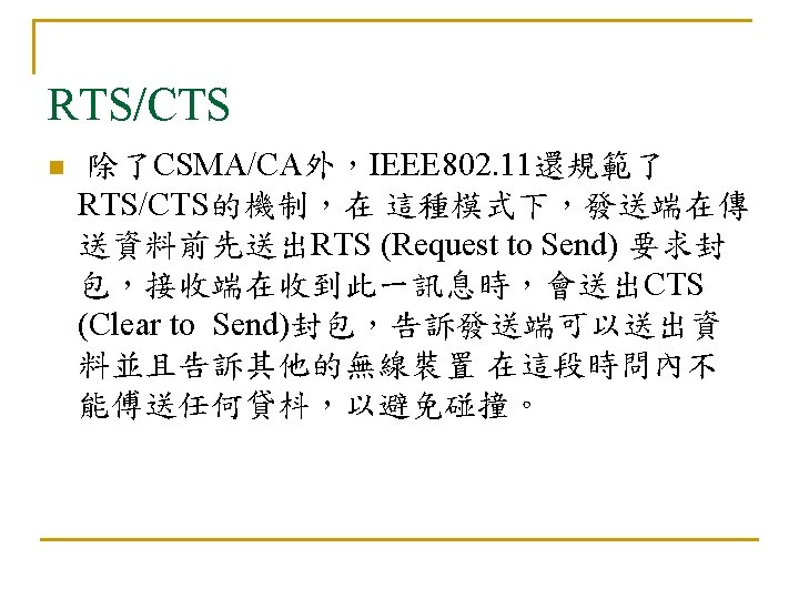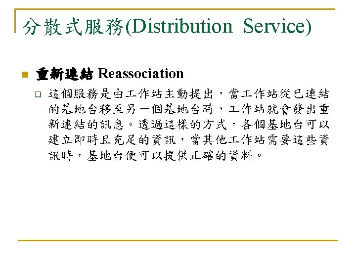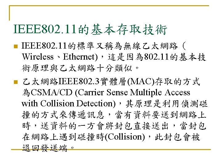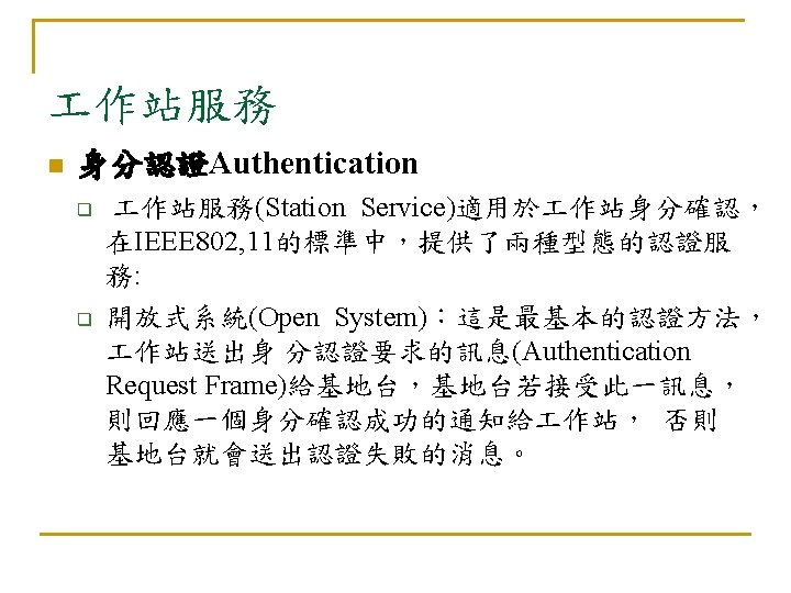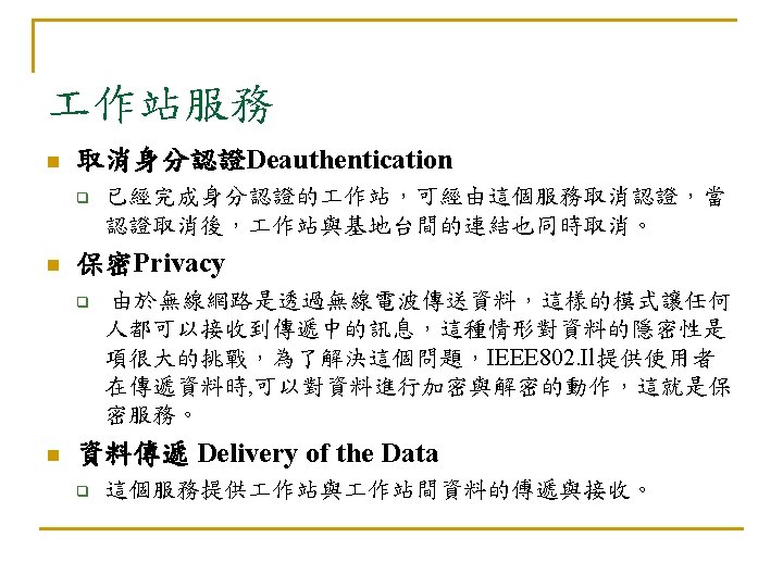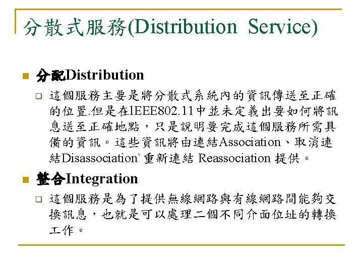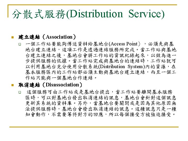 IEEE 802. 11中的服務型態 n 分散式服務(Distribution Service) q q q n 連結(Association) 取消連結(Disassociation') 重新連結(Re-association) 分配(Distribution) 整合(Integration) 作站服務(Station Service) q q 身分認證(Authentication) 取消身分認證(De-authentication) 加密(Privacy) 資料傳遞(Delivery of the Data)