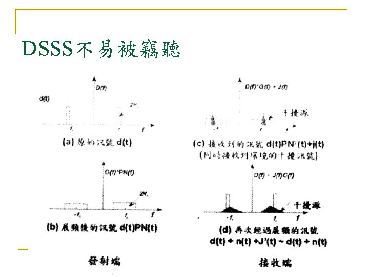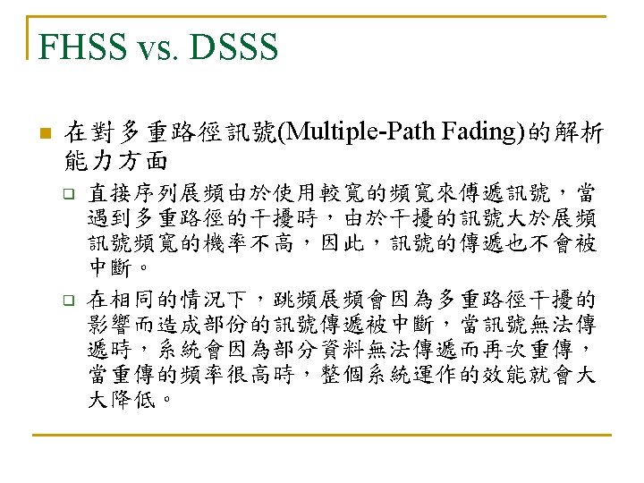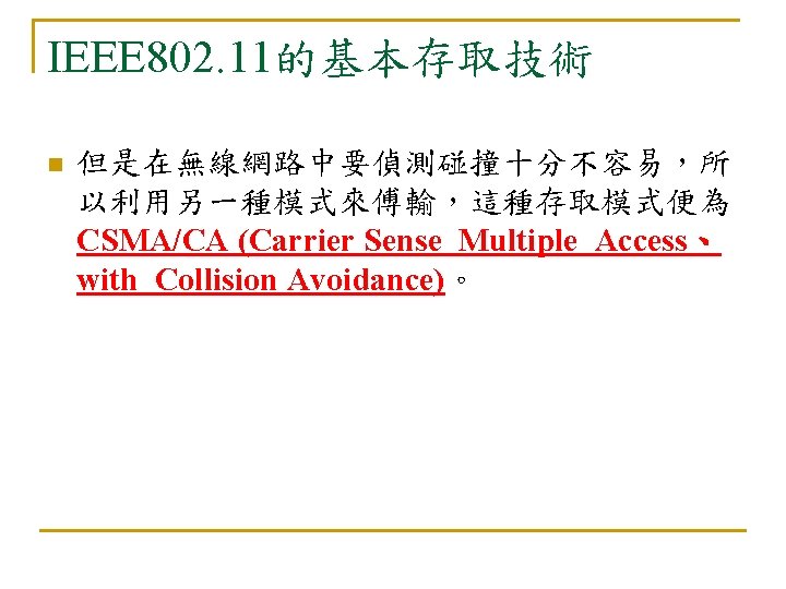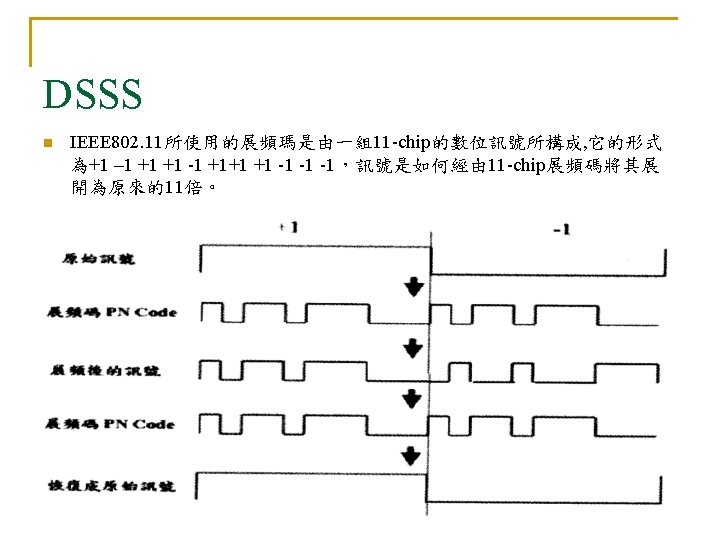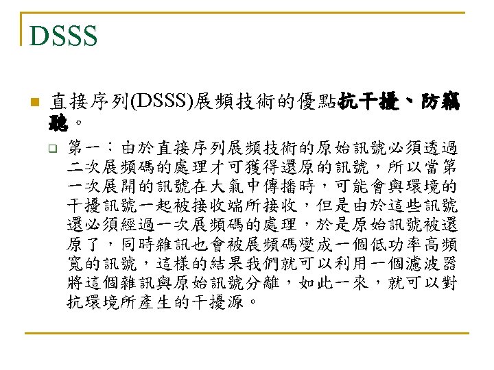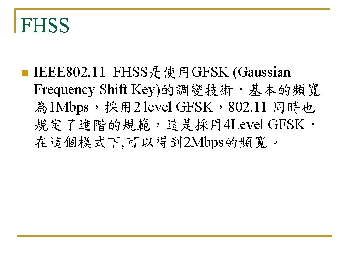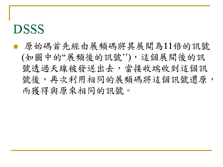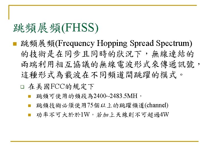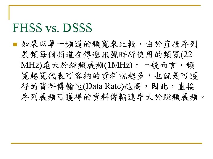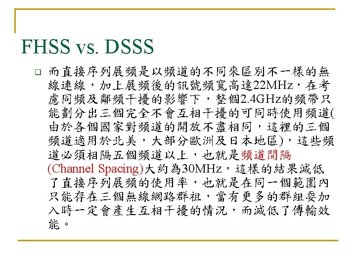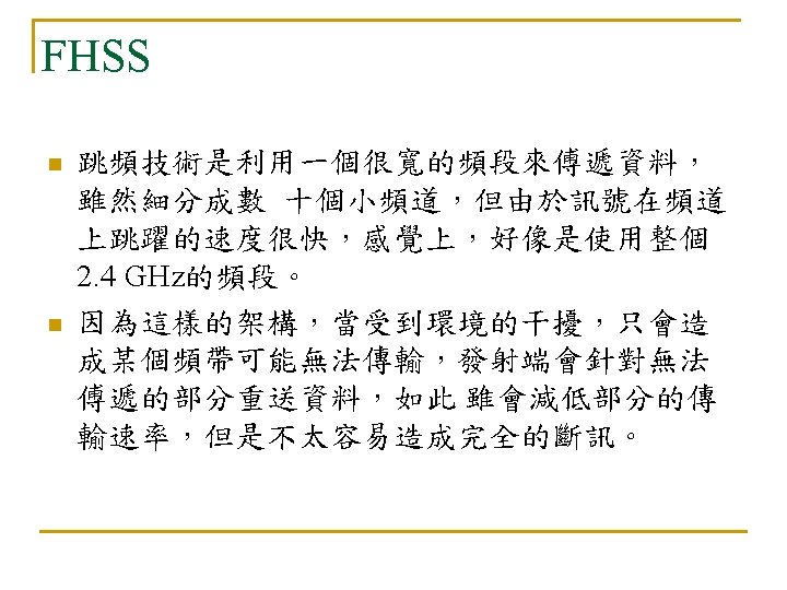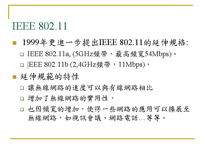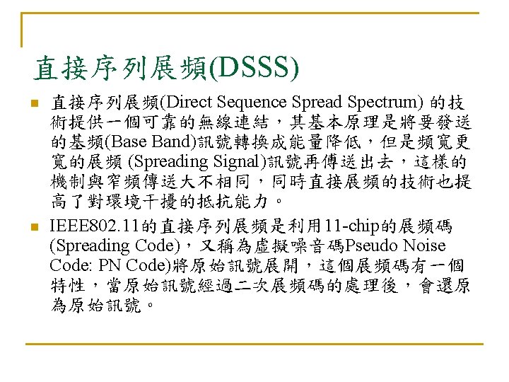 IEEE 802. 11 n 1997年美國電機電子協會 IEEE (institute of Electrical and Electronics Engineer)公告 IEEE 802. 11無線區域網路標準,在這個規範 中,共定義了三種不同的實體屆介面 (Medium Address Control; MAC): q q q 直接序列展頻(Direct Sequence Spread Spectrum ; DSSS) 跳頻展頻(Frequency Hopping Spread Spectrum; FHSS) 紅外線 (lnfrared) 技術