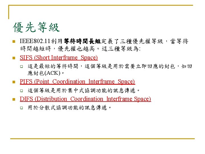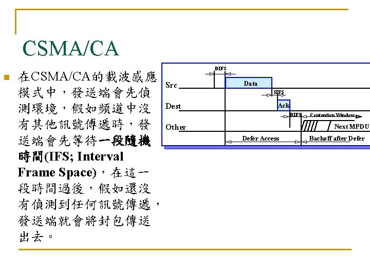 優先等級 Free access when medium is free longer than DIFS Contention Window PIFS DIFS Busy Medium SIFS Backoff-Window Next Frame Slot time Defer Access Select Slot and Decrement Backoff as long as medium is idle.
