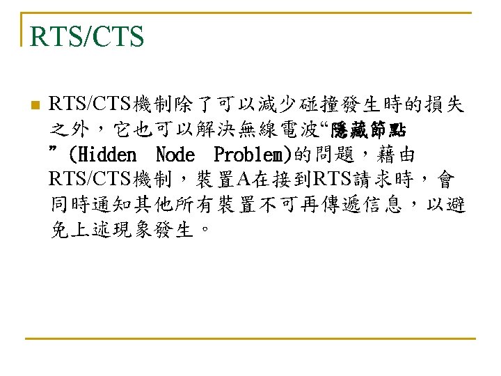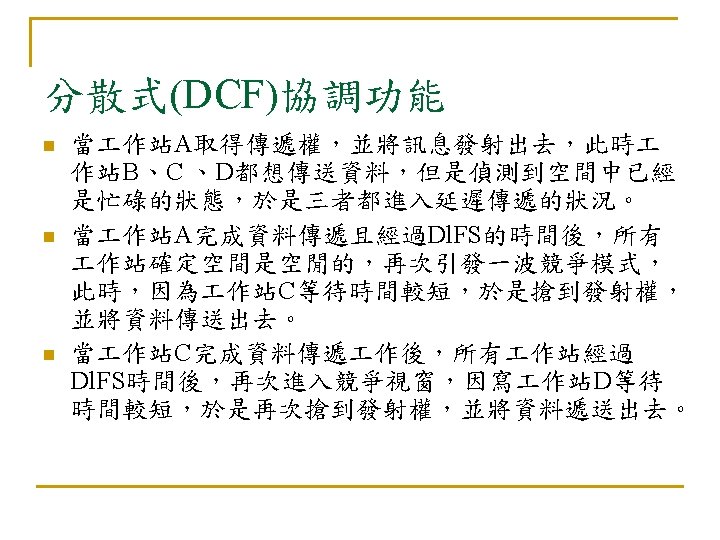 分散式協調功能 DIFS CWindow A Frame Backoff Frame B CWindow C Frame CWindow D E Frame CWindow = Contention Window = Backoff = Remaining Backoff