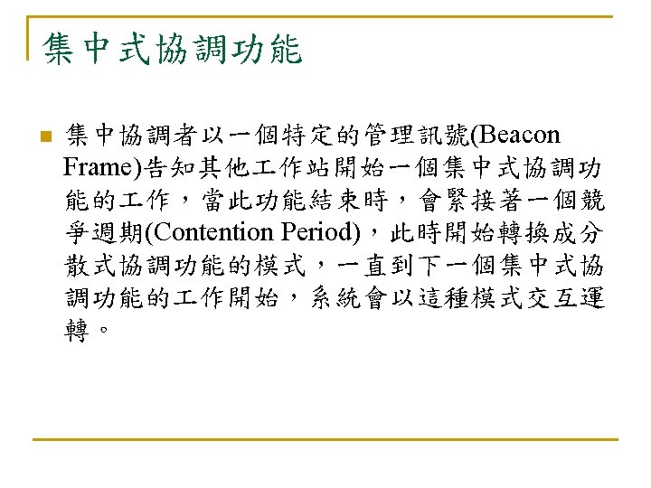 集中式協調功能 CFP repetition interval Contention Free Burst PIFS Contention Period D 1 D 3 D 2 D 4 Busy Medium U 1 U 2 No Up U 4 CF_End Dx = AP-Frame Ux = Station-Frame SIFS Reset NAV Min Contention Period