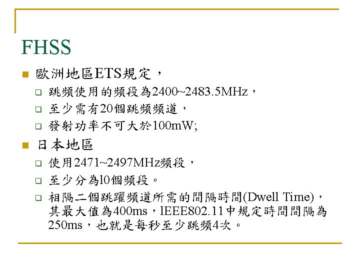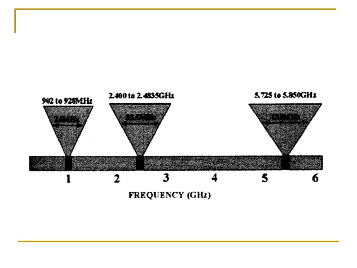 IEEE 802. 11的實體層定義 n IEEE 802. 11規範的無線技術包括: q q q n 直接序列展頻(Direct Sequence Spread Spectrum: DSSS) 跳頻展頻(Frequency Hopping Spread Spectrum: FHSS) 紅外線(Infrared)技術。 其中直接序列展頻以及跳頻展頻都是使用 2. 4 GHz的ISM (Industrial Scientific and Medical) Band的頻段,這個 ISM Band原本是規劃給 業、科學及醫療領域使用之免申請的 頻段,這個頻段包含了三個頻帶: 902~928 MHz、 2. 4000~2. 4835 GHz以及5. 725~5. 850 GHz。