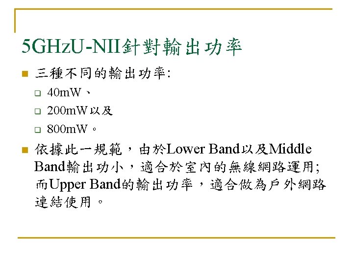 IEEE 802. 11 a n 在美國,5 GHz UNII頻帶被切分為三個頻寬為 100 MHz的頻段, q q 較低頻(Lower Band)的頻段為 5. 15~5. 25 GHz, 其次(Middle Band)為 5. 25~5. 35 GHz, 最高(Upper Band)的頻帶為 5. 725~5. 825 GHz。 其中Lower Band以及Middle Band分成 8個頻道群, Upper Band分為 4個頻道群。