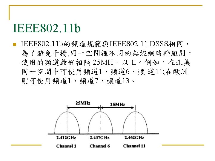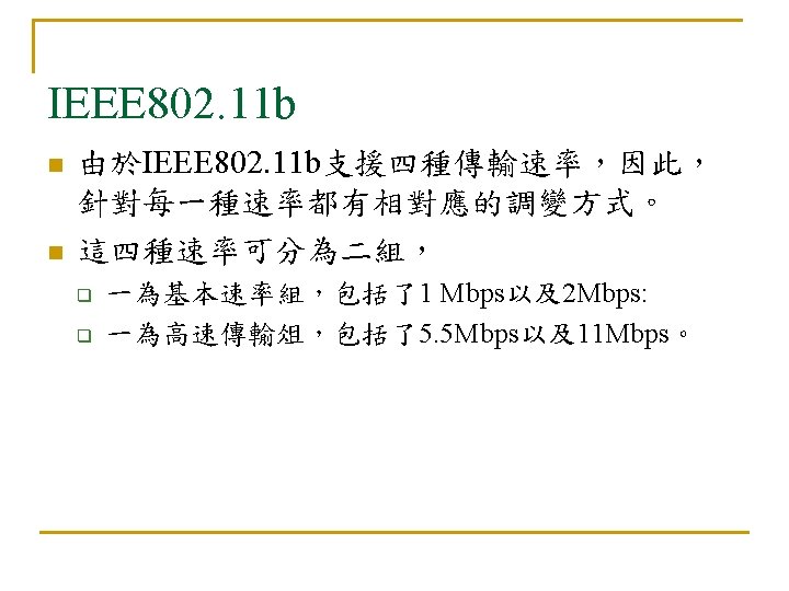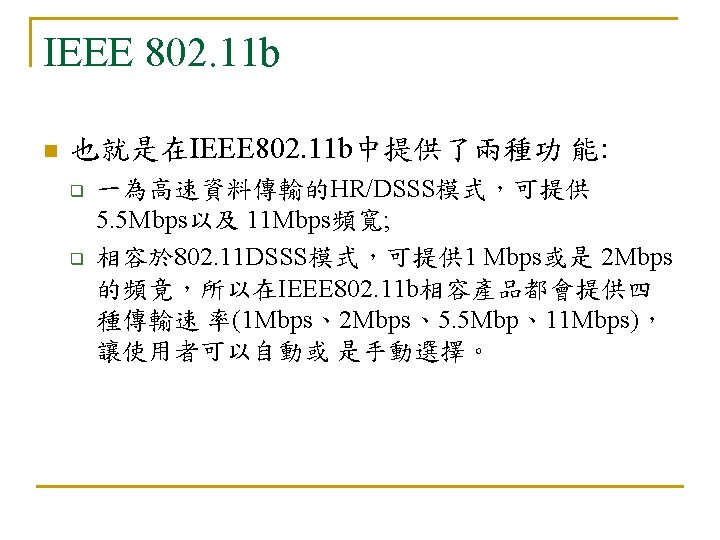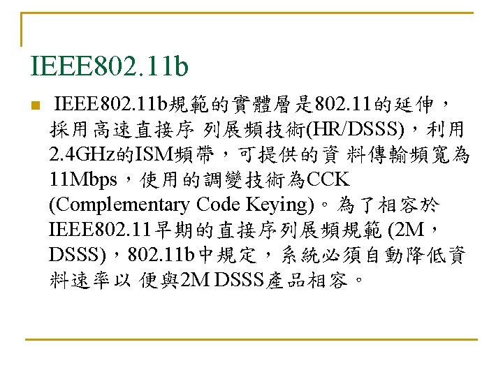 IEEE 802. 11 b n n 其中 1 Mbps的調變方式採用DBPSK (Differential Binary Phase Shift Keying),2 Mbps採用DQPSK(Differentia 1 Quadratic Phase Shift Keying),這兩者都採用 11 -chip的 展頻碼。 而高速傳輸的調變模式則採用CCK,同時亦規範了另 一個選擇性(Option) 調變模式PBCC (Packet Binary Convolution Coding),這個調變模式是為了相容 IEEE 802. 11 FHSS所規範,也就是IEEE 802. 11 b產品可 透過這個方式與IEEE 802. 11 FHSS產品互通,但是目前 大部分的IEEE 802. 11 b產品並不支援此項功能。