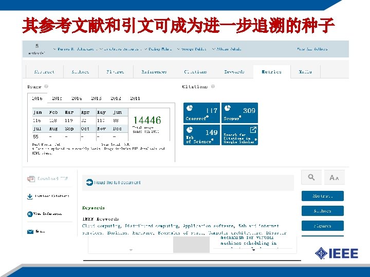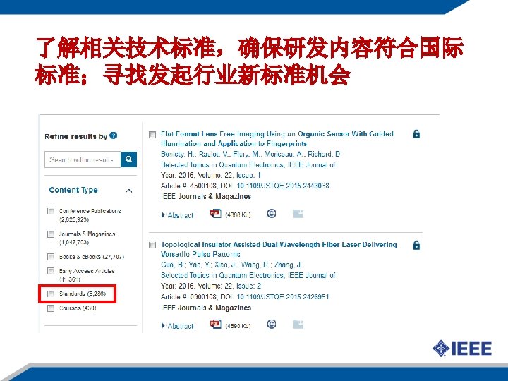 IEEE Xplore 全文数据库 收录 400多万篇文献 180+ IEEE期刊和杂志 1500+ IEEE会议录(每年) 6000+ IEEE标准文档(草案除外) 3000+ IEEE标准文档 20+ IET期刊和杂志 20+ IET会议录(每年) VDE会议录 Bell Labs技术期刊 IBM期刊 MIT期刊 TUP(OA),BIAI… 电子学习课件 IEEE-Wiley电子书 MIT电子书 Morgan & Claypool 综述文集 SMPTE,CSEE(OA) IEEE/IET Electronic Library (IEL) 数据库