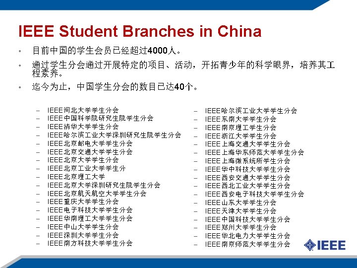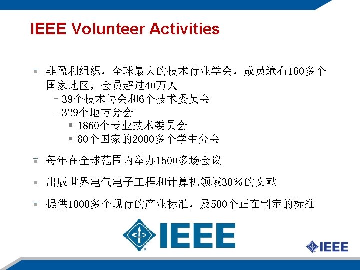欢迎参与IEEE协会活动! Involvement in IEEE Societies, Sections and Chapters 2, 400 IEEE Student Branches worldwide Participation in IEEE GOLD (Graduates of the Last Decade) and Women in Engineering 1500+ conferences per year IEEE Social media, such as Weibo, We. Chat, etc.