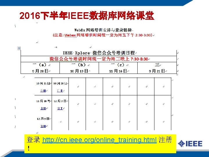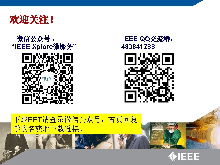 IEEE免费技术讲座 Spectrum免费讲座,涉及最新科技: http: //spectrum. ieee. org/webinars Communication Society免费讲座,通信领域热点技术: http: //www. comsoc. org/webinars Computer Society免费讲座,计算机领域热点技术: http: //www. computer. org/portal/webinars/Register-for-a -Webinar GOLD社团免费讲座,涉及职业发展,人文,科技等内容: http: //www. ieee. org/membership_services/membership/gold /events/index. html 加入志愿者虚拟社团,获得行业最新咨询: https: //www. ieeecommunities. org/