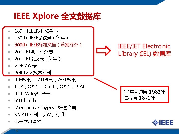 IEEE Xplore IEEE所有文献均上载到 IEEE Xplore平台 http: //ieeexplore. ieee. org 14