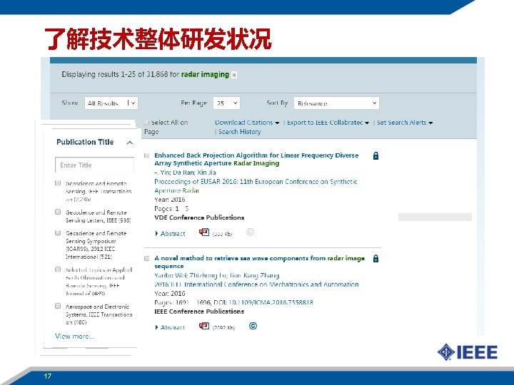 多途径检索核心技术 ANDs search terms ie. fiber optics= fiber AND optics Use quotes (“”) for an exact phrase ie. “fiber optics” Searching metadata only NOT a Full text search Automatic stemming Case insensitive Type-ahead (also known as auto suggest) functionality 16 16