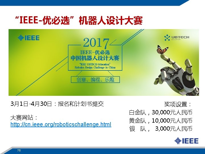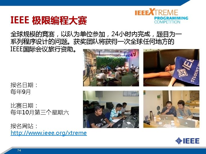 IEEE学生竞赛 • Engineering Projects in Community Service (EPICS) http: //www. ieee. org/education_careers/education/preuniversity /epics_high. html • Engineering for Change https: //www. engineeringforchange. org • IEEE Xtreme 24 -Hour Programming Competition http: //www. ieee. org/xtreme 73