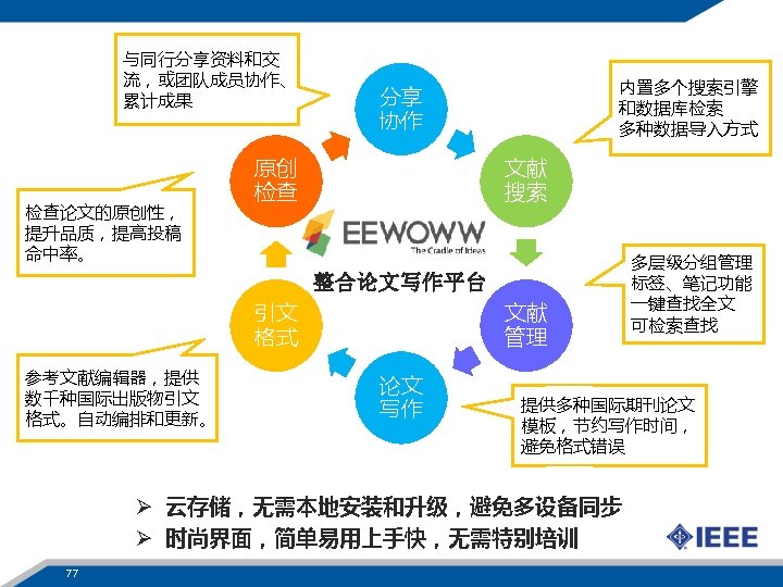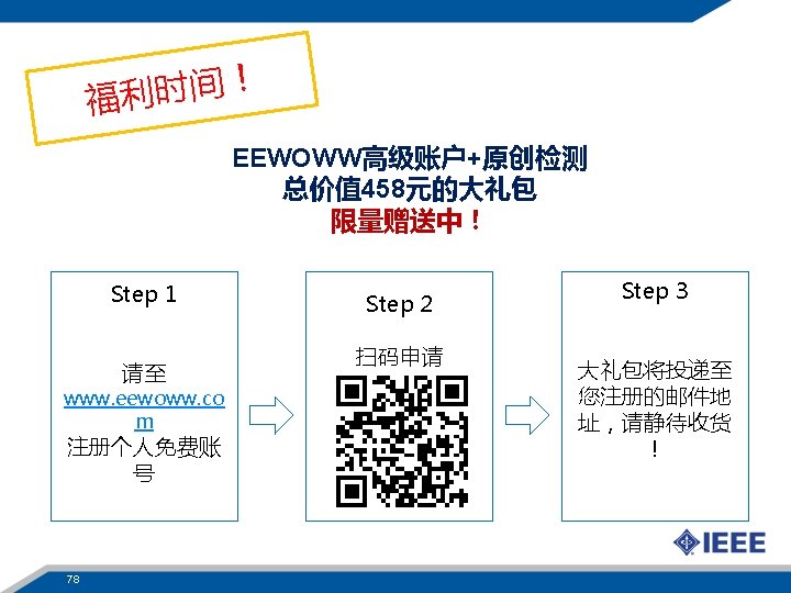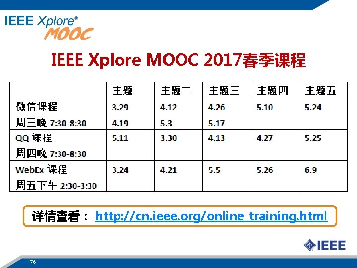 相关网站/微博/微信 IEEE官网:http: //www. ieee. org IEEE中文官网:http: //cn. ieee. org IEEE 数据库:http: //ieeexplore. ieee. org 培训网站:http: //www. ieee. org/go/clientservices 培训视频:http: //www. ieee. org/training IEEE微博:搜索并关注“IEEE中国” IEEE微信:搜索并关注“IEEE中国” 79