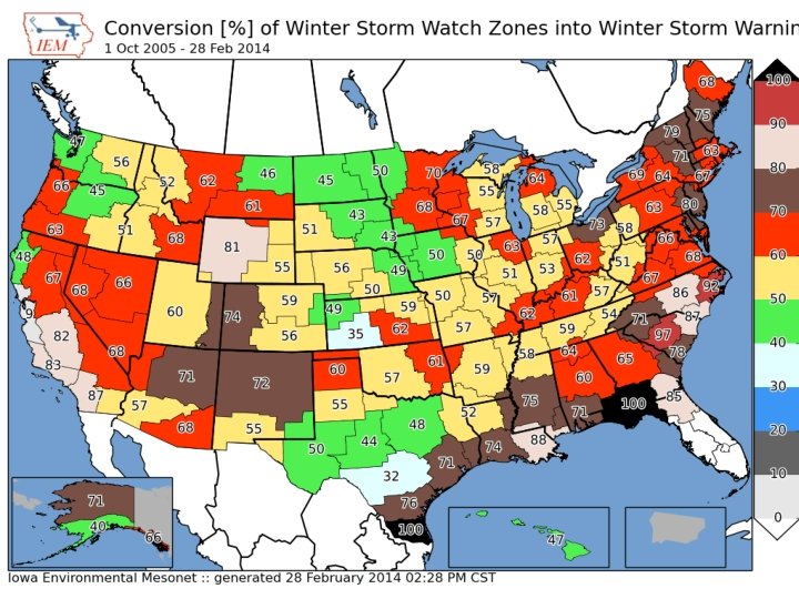 1 Oct 2005 – 28 Feb 2014 NWS Watches before a Warning (double accounting means totals can be over 100%) Winter Storm Watch 51. 2% 8, 702 UGC No Watch Blizzard Warnings 26. 0% Blizzard Watch High Wind Watch Wind Chill Watch 31. 3% 2. 7% 0. 7% 64, 980 UGC Winter Storm Warnings Winter Storm Watch 70. 6% Areal Flood Watch 1. 2% High Wind Watch 0. 8% No Watch 28. 1% Blizzard Watch 0. 7%