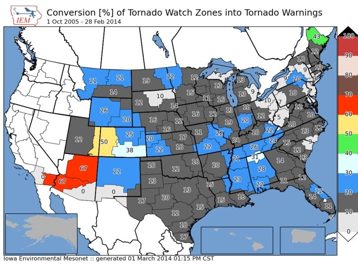 1 Oct 2005 – 28 Feb 2014 NWS Watches before a Warning (double accounting means totals can be over 100%) 54, 020 UGC Tornado Warnings Tornado Watch 69. 9% No Watch 15. 7% SVR Watch 14. 9% 409, 555 UGC No Watch SVR Warnings 41. 4% SVR Watch Tornado Watch 36. 4% 22. 5%