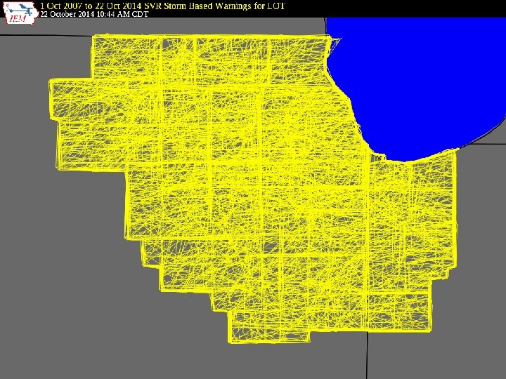 NEXRAD Archives • 1 km composite every 5 minutes back to 1995 • Single site imagery since 1 Jan 2012 • Iowa NEXRADs are backfilled. • LOT recently backfilled as well! • GIS Ready!