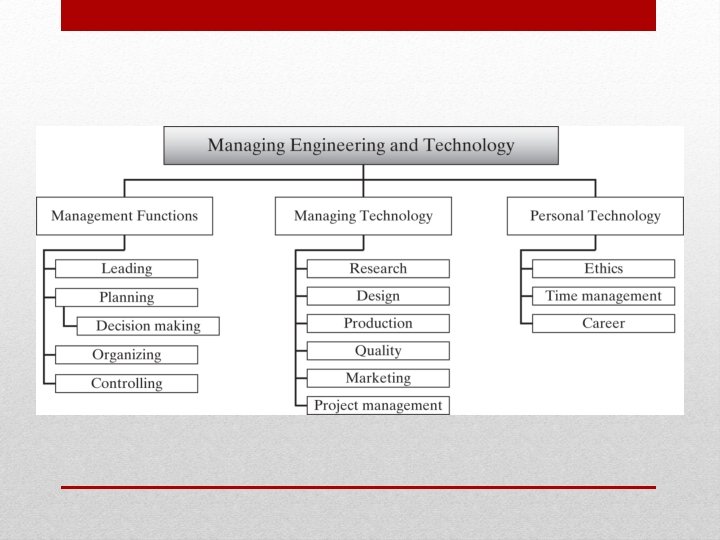 • Direct supervision of engineers or of engineering functions • Or, application of quantifiable methods and techniques to practice of management Engineering Management