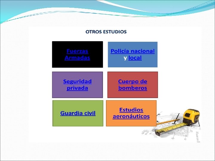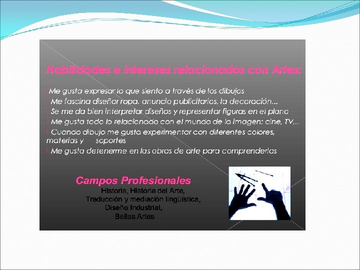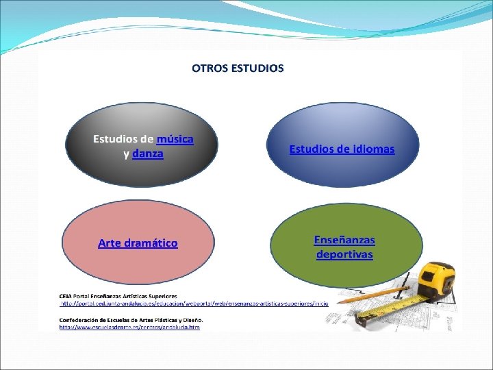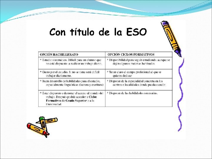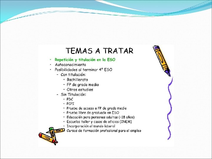Itinerarios para el alumnado de 4º de ESO Alumnos/as con falta de interés y poco hábito de estudio. Con calificaciones negativas a lo largo de la etapa y que han repetido alguna vez. . Que no tienen expectativas para obtener el Título de la ESO. Alumnos/as que tienen interés pero les cuesta estudiar. Sin buenas calificaciones. Ya han repetido alguna vez. Pueden tener problemas para obtener el título de la ESO. Alumnos/as que quieren incorporarse pronto al mundo del trabajo con una titulación profesional. Alumnos/as con buen historial académico, interesados en estudios técnicos y profesionales Alumnos/as que tienen un buen historial académico, desarrollado el hábito de estudio e interés por realizar una carrera universitaria o Ciclos Formativos de Grado Superior. ü FP Básica üExamen Libre título ESO ü E. S. A. ü Curso de preparación Prueba Acceso CFGM üMundo laboral. ü Examen recuperación 5 materias ü Prueba de acceso a Ciclos G. M. ü Examen Libre título ESO ü FP. Básica (antiguo PCPI) ü E. S. A. Ciclos Formativos de Grado Medio Bachillerato en la modalidad correspondiente a la carrera Universitaria o al Ciclo Formativo de Grado Superior que piensen realizar en el futuro.