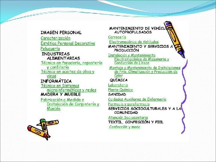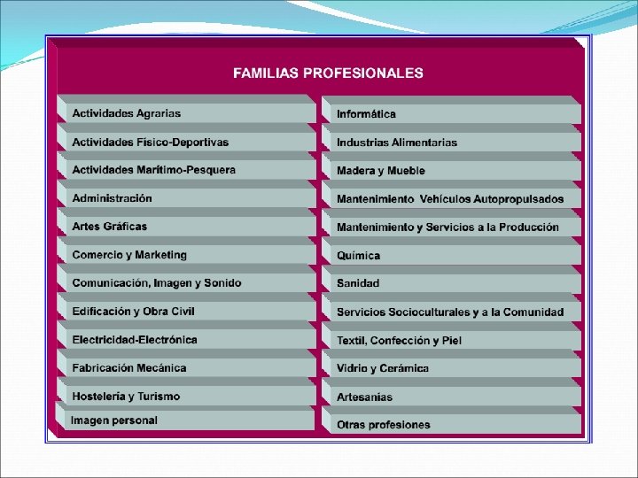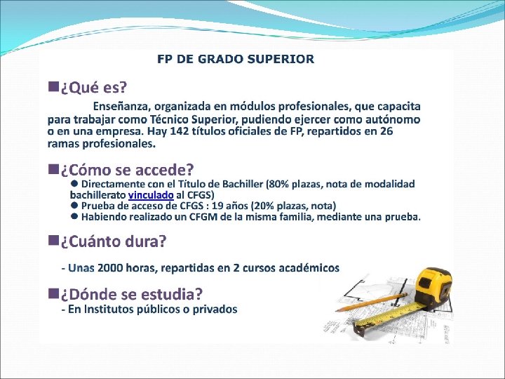 Ciclos Formativos de Grado Medio ¿Qué son los Ciclos Formativos de Grado Medio? Son estudios de Formación Profesional que pretenden dar al alumnado una formación específica para que puedan incorporarse al mundo del trabajo. Con estos estudios se obtiene el Título de Técnico en la correspondiente actividad. Tienen una duración entre 1. 300 y 2. 000 horas. Suelen durar un curso y medio o dos cursos completos. Si apruebas el C. F. G. M. se obtiene el Título de Técnico, para: • Inserción en el mundo laboral • Continuar estudios en Bachillerato o C. F. G. S. (mediante prueba de acceso si se tienen 18 años) PRUEBA DE ACCESO * Cumplir 17 años en el AÑO NATURAL. • Debes plantearte realizarla si tienes dudas acerca de la obtención del Título de Graduado en E. S. O. * Pasos a realizar: • Del 1 -15 de mayo o del 15 -31 de julio solicitar Prueba de Acceso. • Realizar la prueba el 5 de junio / 5 de septiembre. • Solicitar el Ciclo en la secretaría del centro donde se imparte (1 -25 junio). Se reserva el 20% de las plazas, importante la nota. • Matricularse del 10 -16 de julio si se supera la Prueba de Acceso y se obtiene plaza en el Ciclo.