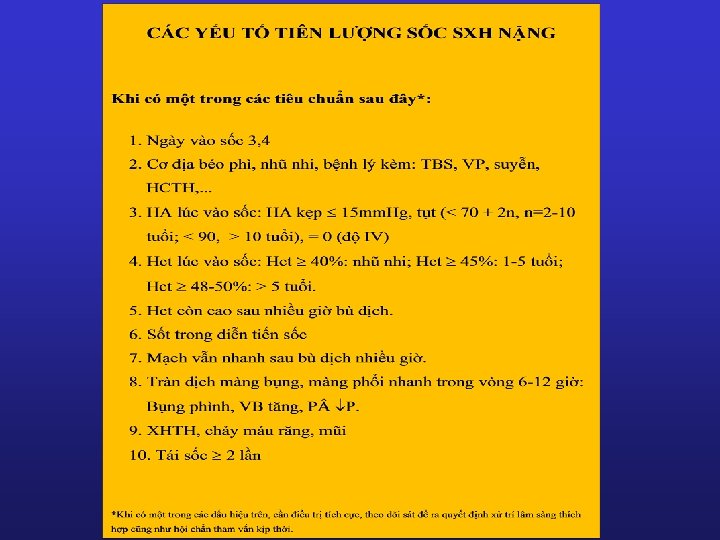 XEÙT NGHIEÄM: · CTM, TC ñeám, Hct/2 -4 g · Ion ñoà, ñöôøng huyeát/dextrostix · Chöùc naêng gan, thaän · Chöùc naêng ñoâng maùu · Khí máu ĐM, CVP, Lactate máu/6 g · XQ phoåi · Sieâu aâm ngöïc, buïng · Huyeát thanh chaån ñoaùn SXH