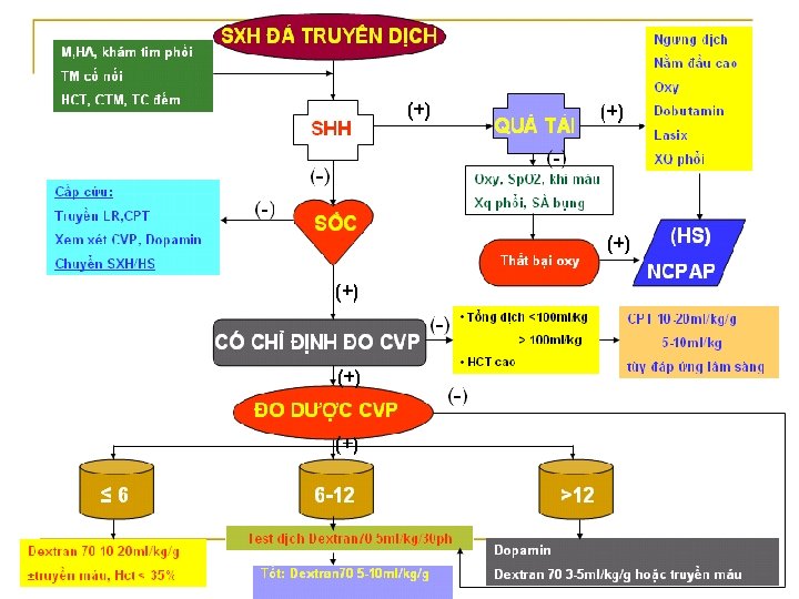 TRUYEÀN DÒCH CHỐNG SỐC SOÁC KEÙO DAØI § Daáu quaù taûi CVP<12 Quaù taûi (-) Hct<35 Máu 3 -5 -20 ml/kg/g, kèm CPT § CVP § Hct >35 CPT 5 -20 ml/kg/g CVP 12 -15 Quùa taûi (-) Test CPT 5 ml/kg/30’ Caûi thieän: LS + CVP <15 cm. H 2 O (+) CPT 5 -10 ml/kg/g CVP>15 Quaù taûi DOPA DOBU (-)