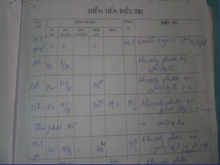 Xöû trí taïi BV tuyến trước Ngaøy giôø Laâm saøng M HA 18/3 22 g 100 95/70 23 g 100/70 19/3 1 g 15 100/70 5 g 15 100 9 g 15 100/60 13 g 15 100 120/90 14 g 15 100 110/80 16 g 15 100 17 g CVP NT Khaùc TC 57000 Hct (%) 50 Ñieàu trò LR 20 ml/kg/g × 1 LR 10 ml/kg/g × 2 200 46 LR 7, 5 ml/kg/g × 4 44 LR 5 ml/kg/g × 4 44 Dextran 60 5 ml/kg/g × 4 46 Dextran 60 5 ml/kg/g × 1 100 36 Dextran 60 3 ml/kg/g 100/70 100 37 Dextran 60 3 ml/kg/g 100/70 200 37 Dextran 60 3 ml/kg/g 200