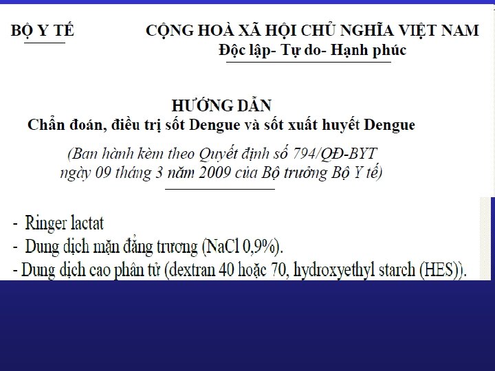 Thay đổi Hct Sau liều 20 ml/kg/giờ LR/NS: Hct giảm # 5% Gelatin: #7% Dextran, HES 200: giảm 10% Wills BA. Dung NM. Loan HT. et al. Comparison of three fluid solutions for resuscitation in dengue shock syndrome. N Engl J Med 2005; 353: 877 -89. Ngo NT. Cao XT. Kneen R. et al. Acute management of dengue shock syndrome: a randomized double-blind comparison of 4 intravenous fluid regimens in the first hour. Clin Infect Dis 2001; 32: 204 -13 Dung NM. Day NP. Tam DT. et al. Fluid replacement in dengue shock syndrome: a randomized. double-blind comparison of four intravenousfluid regimens. Clin Infect. Dis 1999; 29: 787 -94