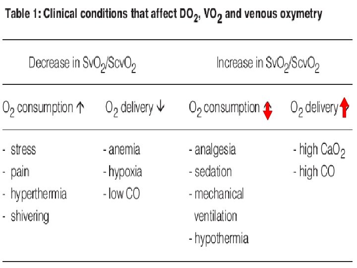 w Oxygen supply or delivery DO 2 = CO x Ca. O 2 = (Hb x 1, 36 x Sa. O 2) + (Pa. O 2 x 0, 0031) w Oxygen consumption (VO 2) VO 2 = CO x (Ca. O 2 – Cv. O 2) Cv. O 2 = Ca. O 2 – VO 2 / CO Cv. O 2 = (Hb x 1, 36 x Sv. O 2) + (Pv. O 2 x 0, 0031) Cv. O 2 ≈ (Hb x 1, 36 x Sv. O 2) w ERO 2: oxygen extraction ratio. ERO 2 = VO 2 / DO 2 * 100% Sv. O 2 = 1 – ERO 2