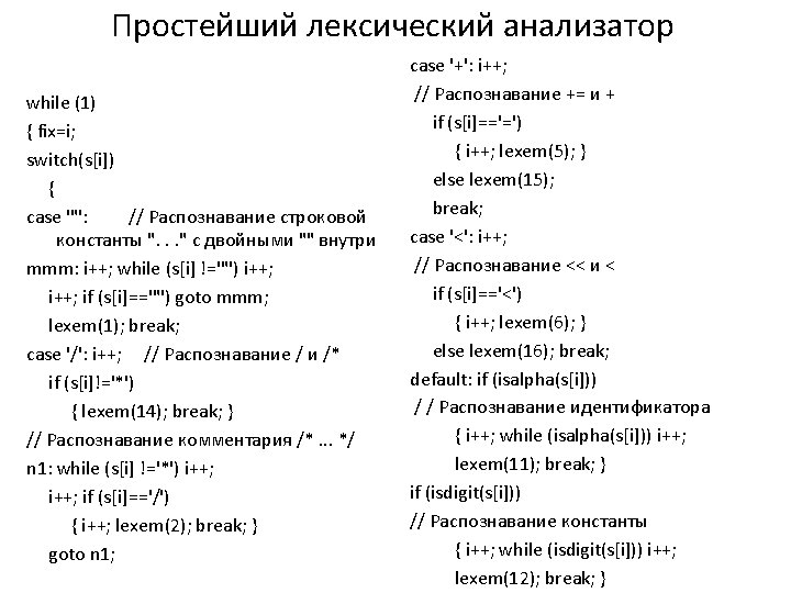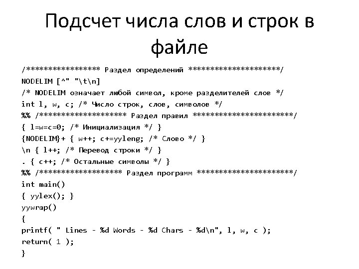 "(*" | "{" { register int c; while ((c = input())) { if (c == '}') break; else if (c == '*') { if ((c = input()) == ')') break; else unput (c); } else if (c == 'n') line_no++; else if (c == 0) commenteof(); } } [ tf] ; n line_no++; . { fprintf (stderr, "'%c' (0%o): illegal charcter at line %dn", yytext[0], line_no); } %% commenteof() { fprintf (stderr, "unexpected EOF inside comment at line %dn", line_no); exit (1); } yywrap () { return (1); }
