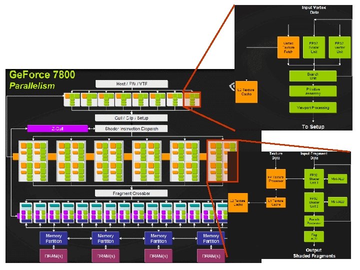 Vertex Shader • Un programme plus long ralentit le pipeline • SIMD: chaque instruction sur un vecteur (r. x, r. y, r. z, r. w) est traitée en parallèle • Ge. Force 3+4 and Radeon 8500/9700: – 128/256 instructions par vertex shader