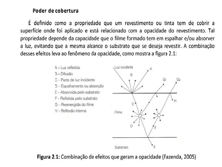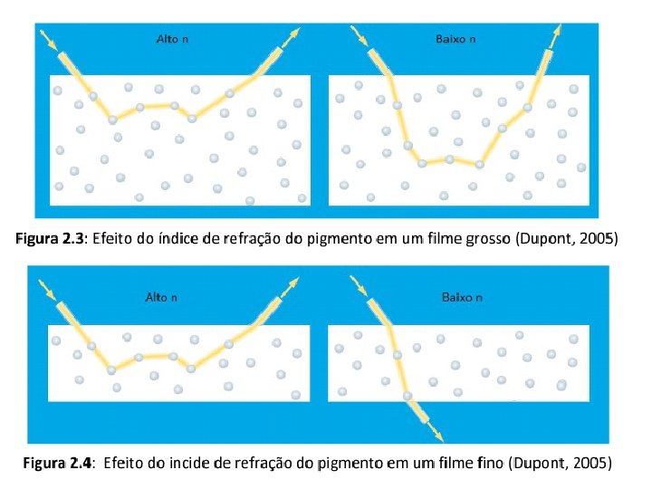 Dispersão da luz • O raio de luz que incide na partícula é desviado porque a luz viaja mais lentamente através de um pigmento com alto índice de refração do que em um com baixo índice. • Diferentemente de outros pigmentos coloridos que fornecem opacidade absorvendo a luz visível, pigmentos brancos fornecem opacidade dispersando a luz. Isso é possível porque o pigmento branco tem o poder de desviar a luz. A dispersão é obtida pela refração e difração da luz que passa através ou próxima de partículas do pigmento.