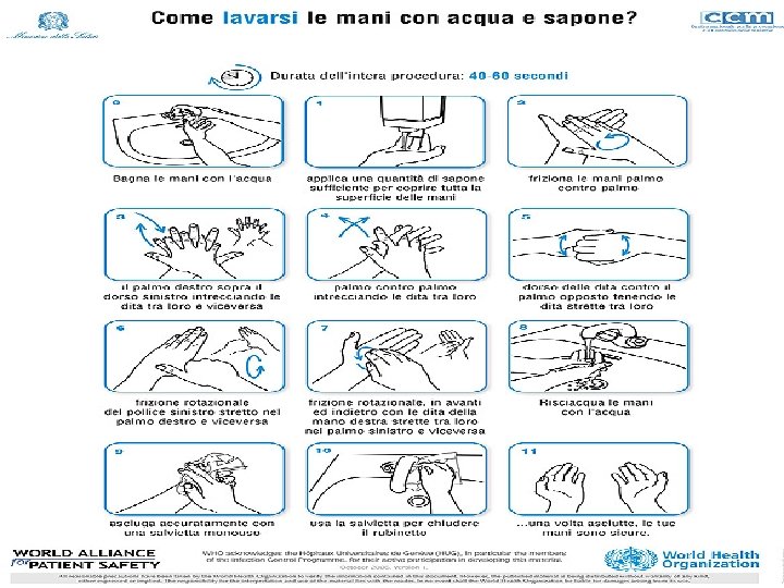 TECNICA DI LAVAGGIO DELLE MANI 1. Togliere orologio e gioielli, arrotolare le maniche sopra i gomiti (migliora l’abilità nel lavarsi le mani e i polsi); inumidire le mani con acqua (evitare l’acqua molto calda perché asciuga la cute); prendere una piccola quantità di sapone (3 -5 m. L) 2. Distribuirla nelle mani frizionando palmo contro palmo 3. Palmo sopra il dorso intrecciando le dita, dorso delle dita contro il palmo 4. Palmo contro palmo intrecciando le dita tra di loro 5. Dorso delle dita contro il palmo opposto, tenendo le dita strette tra loro 6. Frizione rotazionale del pollice nel palmo della mano 7. Frizione rotazionale con le dita sul palmo della mano 8. Sciacquare bene tutte le superfici delle mani, con abbondante acqua corrente (rimuovere tutto il sapone previene le irritazioni); asciugare le mani accuratamente, senza strofinare, con un tovagliolo di carta 9. Usare un tovagliolo di carta chiudere il rubinetto, per evitare l’ulteriore contaminazione delle mani; usare un prodotto idratante dopo il lavaggio (i microrganismi aderiscono più facilmente sulla cute asciutta e