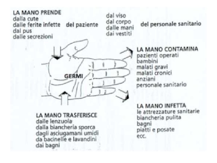 IGIENE DELLE MANI • LA CUTE DELLE MANI E’ INTERESSATA DA 2 POPOLAZIONI MICROBICHE: 1. FLORA RESIDENTE (STAFILOCOCCHI, CORYNEBATTERI) 2. FLORA TRANSITORIA (E’ QUELLA CHE PERVIENE SULLE MANI A SEGUITO DI CONTATTI CON INDIVIDUI E MATERIALI) E’ COSTITUITA ANCHE DA GERMI PATOGENI I QUALI POSSONO SOPRAVVIVERE PER NON PIU’ DI 24 h )