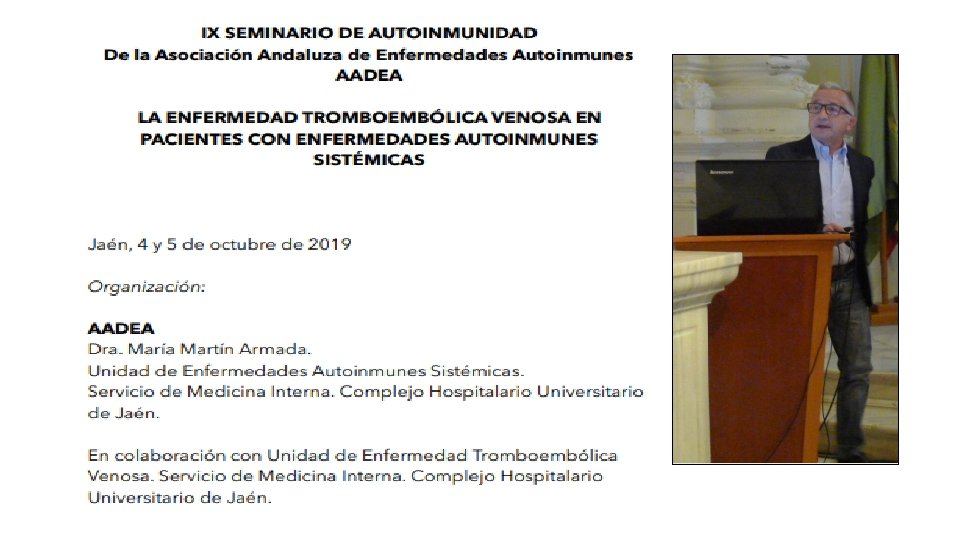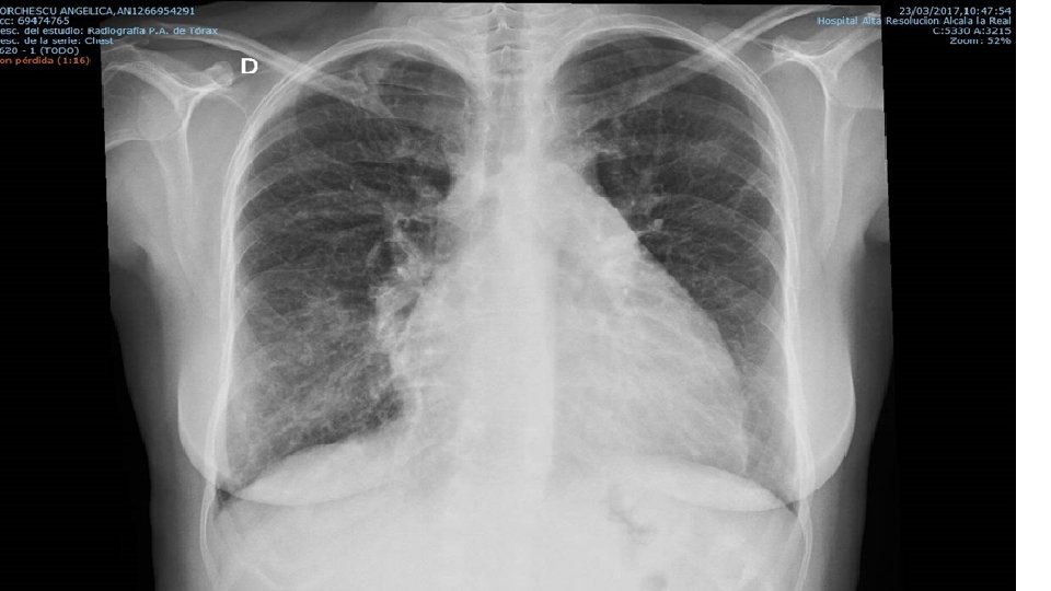 • 12. 2015: • Disnea. Anemia. Menorrragias • EF: taquipnea. EY (+). TA: 107/65. ACR: Ø • LAB: BNP: 496. Hb: 6 gr/d. L • RMN: Leiomiomas • ECOCARDIO: PAPs: 55. VD dilatado. FE limítrofe. • angio. TAC: • • No signos TEP No cavitaciones (TBC) Vidrio deslustrado parcheado Cardiomegalia derecha. ↑ tamaño art. pulmonar • TRATAMIENTO: • Histerectomía • Acenocumarol • Bosentan + Sildenafilo (prescrito por U. Enf. Autoinmunes)