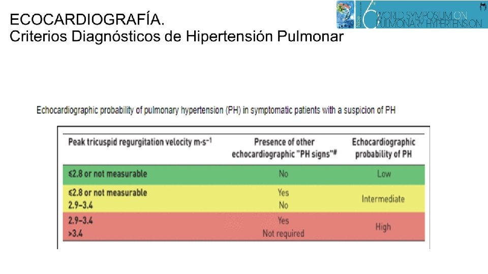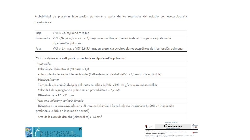 Diagnóstico HPTEC ECOCARDIOGRAFÍA • Estudio de imagen inicial para establecer el diagnóstico de HP: • Estimación de la PAPs • Evaluación de signos indirectos de HP y de disfunción de corazón derecho • Detección de patologías alternativas o potenciales causantes de HP • La confirmación diagnóstica de HP requiere cateterismo derecho