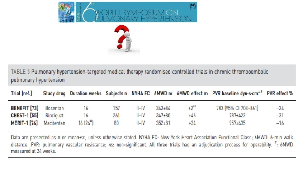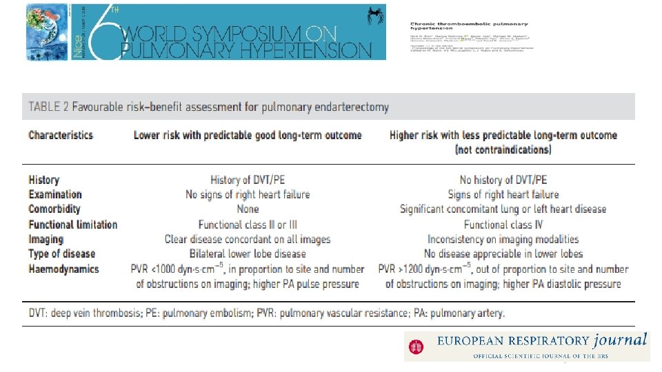 TROMBOENDARTERECTOMÍA • Tratamiento de elección. • Debe considerarse en todo paciente con HPTEC • Selección de pacientes • Experiencia centro (equipo quirúrgico, cuidados post-operatorios…) • “Concordancia” extensión / nivel obstrucción arterial resistencias vasculares pulmonares (RVP). • Obstrucciones distales con ↑↑↑ RVP sugieren “vasculopatía” asociada → HP persistente • Mortalidad: 3. 8% • Supervivencia 5 años: 96%.