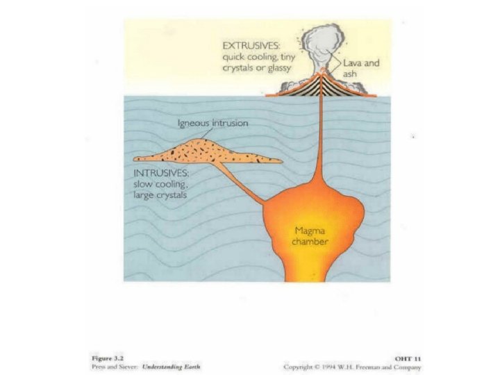 Plutonic vs. Volcanic Rocks • The major division for igneous rocks is based on rate of cooling. Plutonic rocks or intrusive rocks cool slowly within the earth. They produce relatively large and interlocking crystals. • Volcanic rocks or extrusive rocks form when lava cools on the Earth’s surface. They cool rapidly and the crystals that form are relatively small.