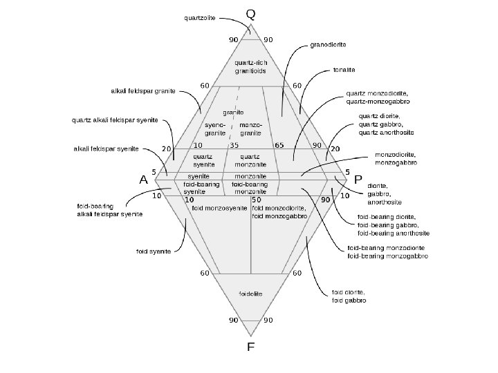 Plutonic vs. Volcanic Rocks • Plutonic and volcanic rocks have different names. They are classified by their percentage of ferromagnesian minerals. Dark minerals typically contain more iron and magnesium.