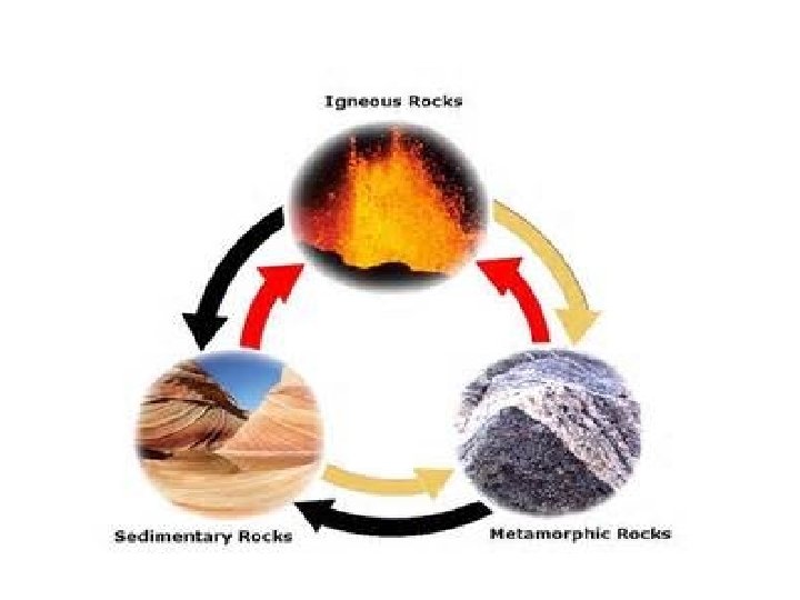 • There are three broad classes of rock: • Igneous rock – formed when molten magma or lava cools • Sedimentary rock – formed either from eroded sediment (mud, sand, gravel, etc) that is deposited and cemented together into new rock, or forms by precipitating out of solution. • Metamorphic rock – formed when a rock experiences intense heat and pressure, altering the rock’s mineralogy and characteristics.